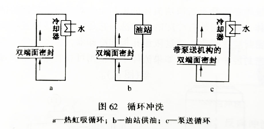 循環(huán)沖洗是經(jīng)過一個(gè)泵送裝置使外加的密封流體進(jìn)行循環(huán)(圖62)。這里有兩點(diǎn)需要引起留意,一是“泵送裝置”,可以是外加的油站和密封腔形成閉合回路進(jìn)行循環(huán),也可在密封腔中裝設(shè)一個(gè)泵,或者是用熱虹吸的原理使流體循環(huán)。另一點(diǎn)要留意的是“外加的密封流體”。這種沖洗方法用在雙端面或多端面密封上,在單端面密封上不選用。循環(huán)沖洗也有人稱為“外循環(huán)”。