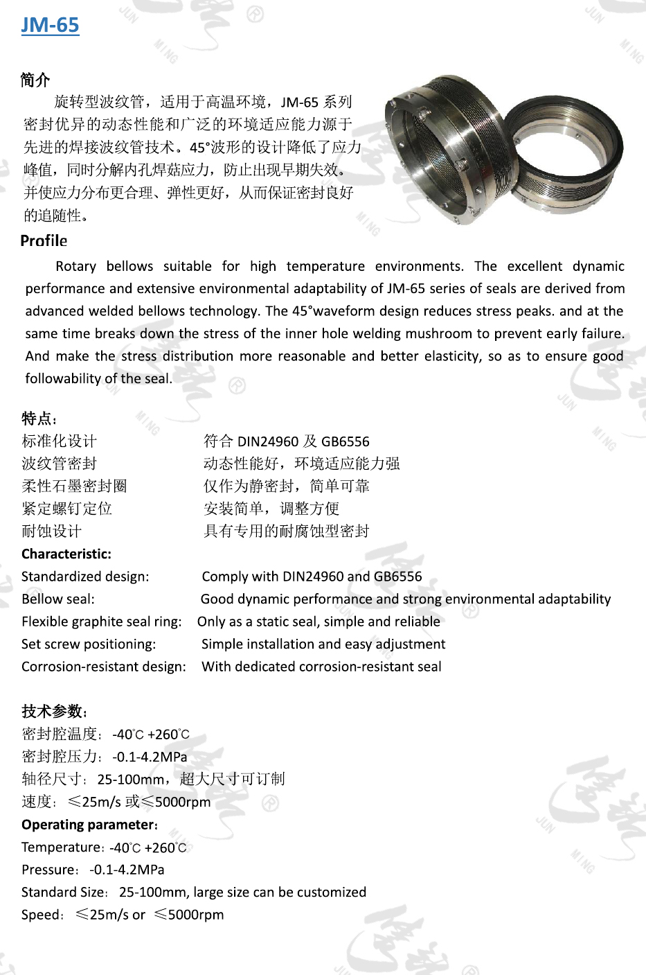 旋轉型波紋管,適用于高溫環(huán)境,JM-65系列密封優(yōu)異的動態(tài)性能和廣泛的環(huán)境適應能力源于先進的焊接波紋管技術。45°波形的設計降低了應力峰值,同時分解內孔焊菇應力,防止出現(xiàn)早期失效。并使應力分布更合理、彈性更好,從而保證密封良好的追隨性。