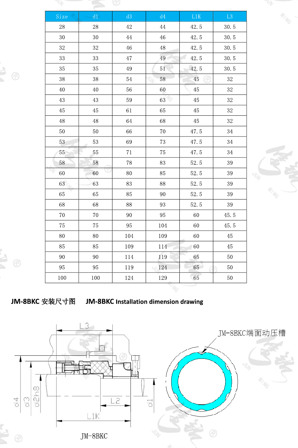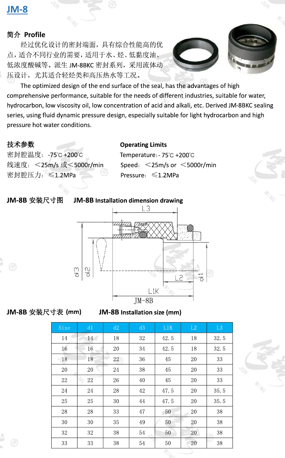 經(jīng)過優(yōu)化設(shè)計的密封端面,具有綜合性能高的優(yōu)點,適合不同行業(yè)的需要,適用于水、烴、低黏度油、低濃度酸堿等。派生JM-8BKC密封系列,采用流體動壓設(shè)計,尤其適合輕烴類和高壓熱水等工況。