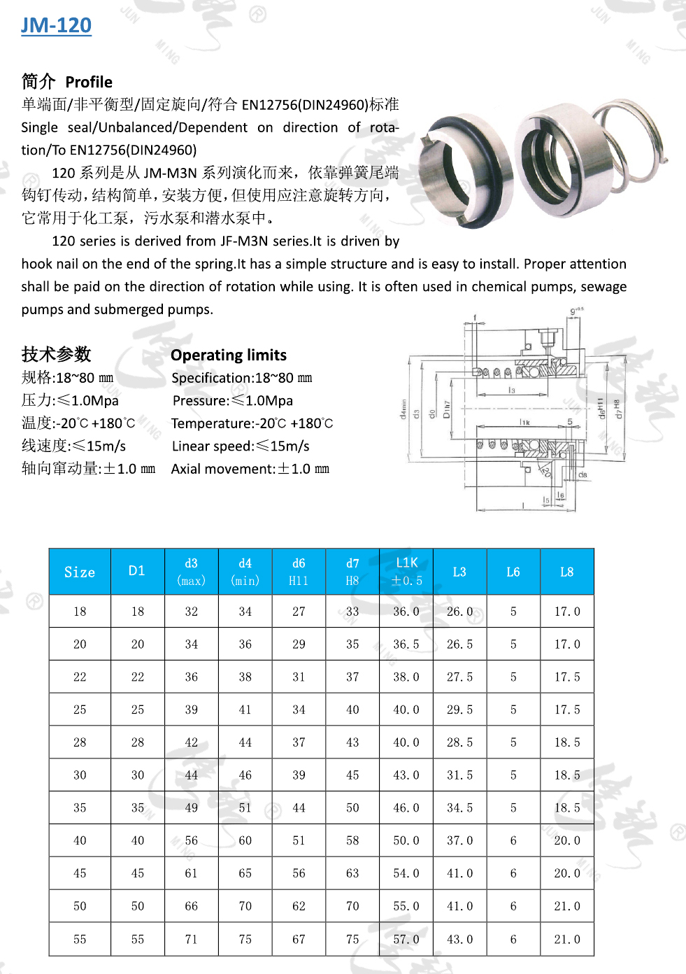 120系列是從JM-M3N系列演化而來,依靠彈簧尾端鉤釘傳動,結(jié)構(gòu)簡單,安裝方便,但使用應(yīng)注意旋轉(zhuǎn)方向,它常用于化工泵,污水泵和潛水泵中。