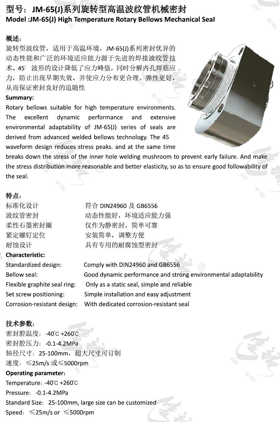 旋轉(zhuǎn)型波紋管,適用于高溫環(huán)境,JM-65(J)系列密封優(yōu)異的動(dòng)態(tài)性能和廣泛的環(huán)境適應(yīng)能力源于先進(jìn)的焊接波紋管技術(shù)。45°波形的設(shè)計(jì)降低了應(yīng)力峰值,同時(shí)分解內(nèi)孔焊菇應(yīng)力,防止出現(xiàn)早期失效。并使應(yīng)力分布更合理、彈性更好,從而保證密封良好的追隨性