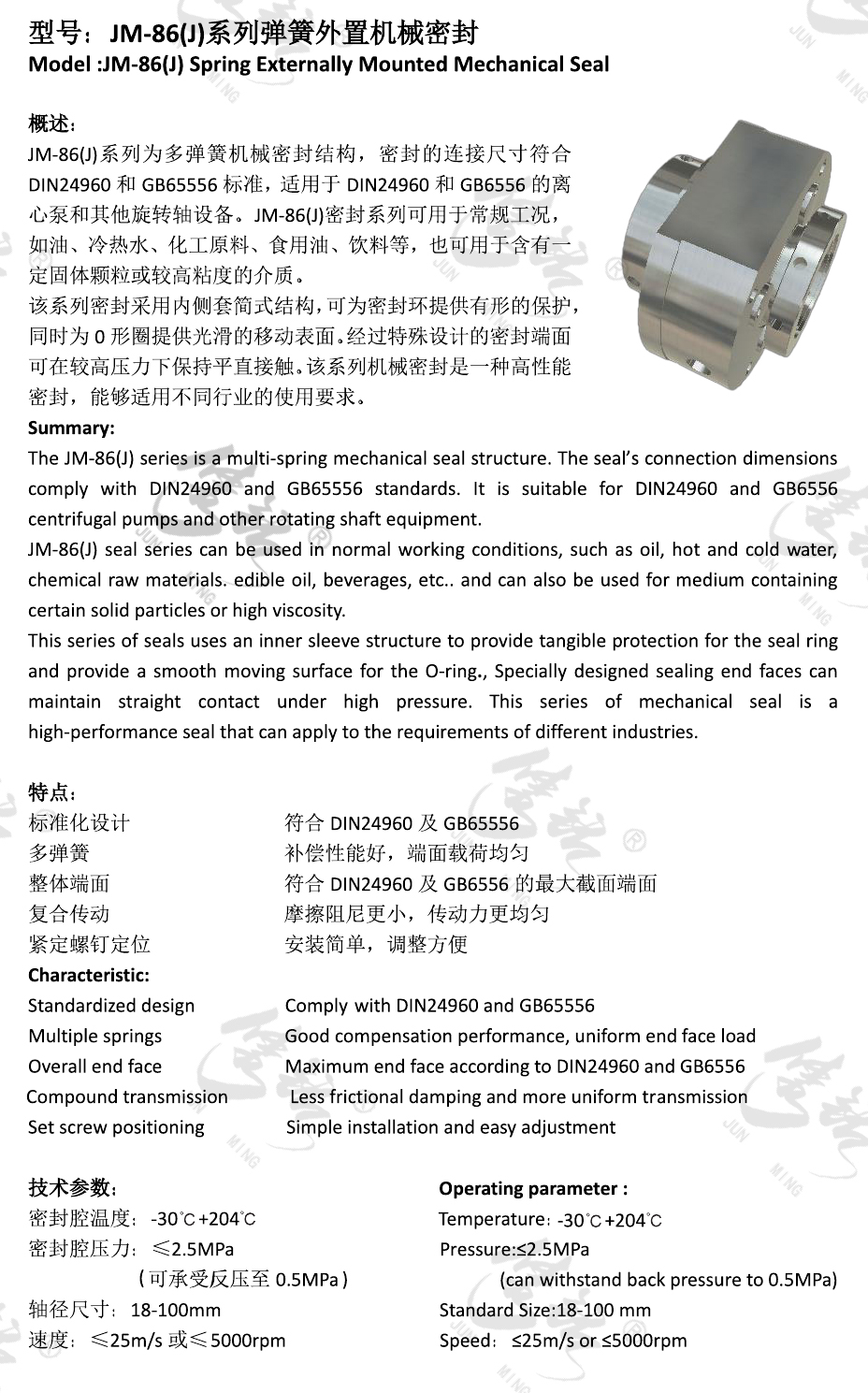 JM-86(J)系列為多彈簧機械密封結(jié)構(gòu),密封的連接尺寸符合DIN24960和GB65556標準,適用于DIN24960和GB6556的離心泵和其他旋轉(zhuǎn)軸設(shè)備。JM-86(J)密封系列可用于常規(guī)工況,如油、冷熱水、化工原料、食用油、飲料等,也可用于含有一定固體顆?;蜉^高粘度的介質(zhì)。