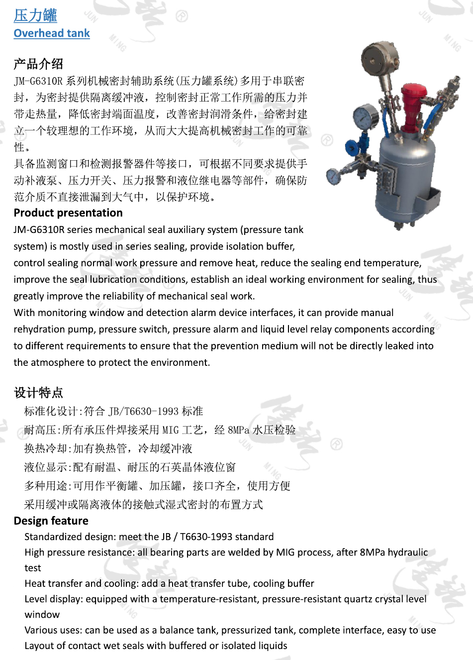 JM-G6310R系列機(jī)械密封輔助系統(tǒng)(壓力罐系統(tǒng))多用于串聯(lián)密封,為密封提供隔離緩沖液,控制密封正常工作所需的壓力并帶走熱量,降低密封端面溫度,改善密封潤滑條件,給密封建立一個(gè)較理想的工作環(huán)境,從而大大提高機(jī)械密封工作的可靠性。