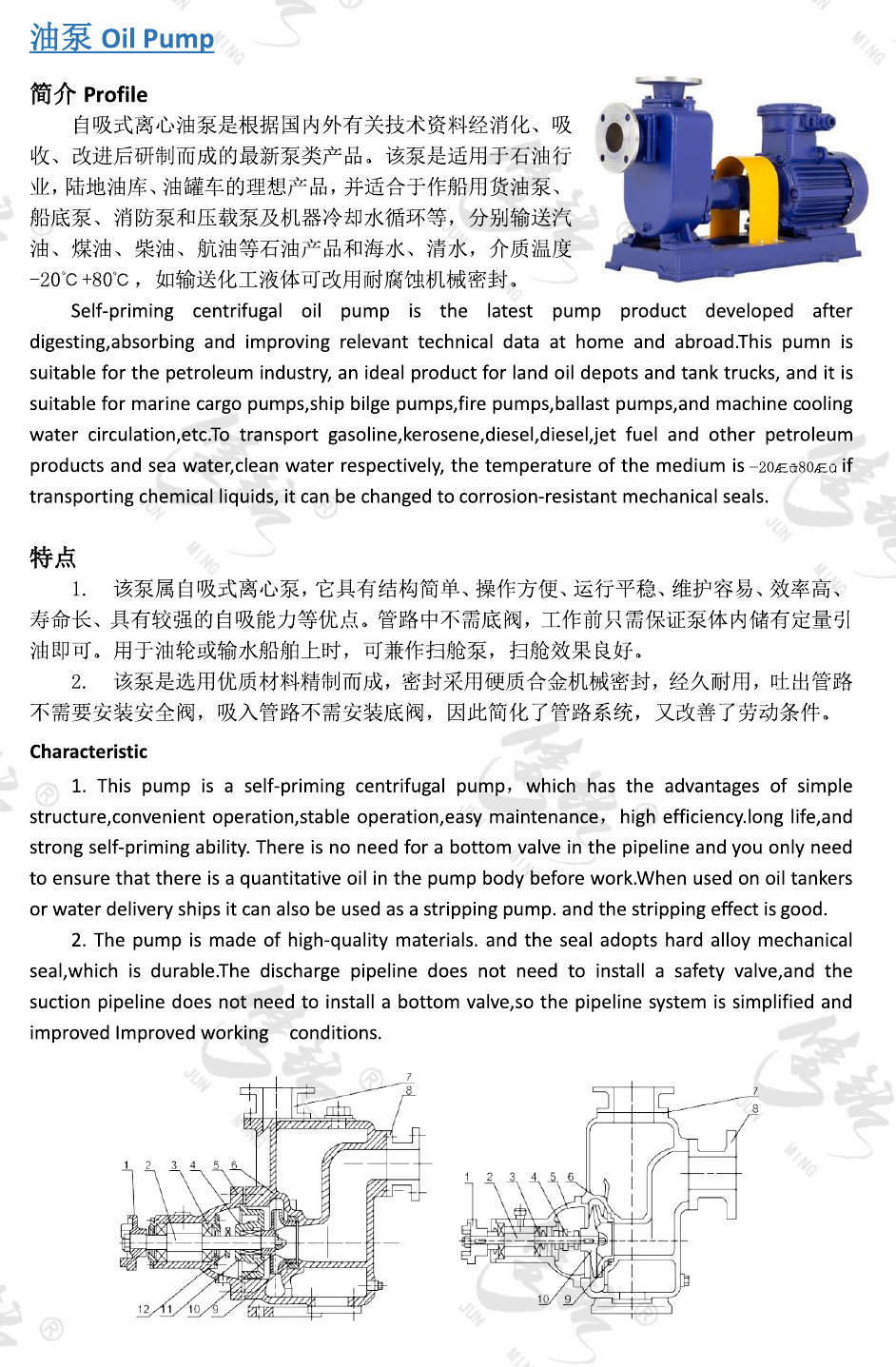 自吸式離心油泵是根據(jù)國(guó)內(nèi)外有關(guān)技術(shù)資料經(jīng)消化、吸收、改進(jìn)后研制而成的最新泵類產(chǎn)品。該泵是適用于石油行業(yè),陸地油庫(kù)、油罐車的理想產(chǎn)品,并適合于作船用貨油泵、船底泵、消防泵和壓載泵及機(jī)器冷卻水循環(huán)等,分別輸送汽油、煤油、柴油、航油等石油產(chǎn)品和海水、清水,介質(zhì)溫度-20℃+80℃,如輸送化工液體可改用耐腐蝕機(jī)械密封。