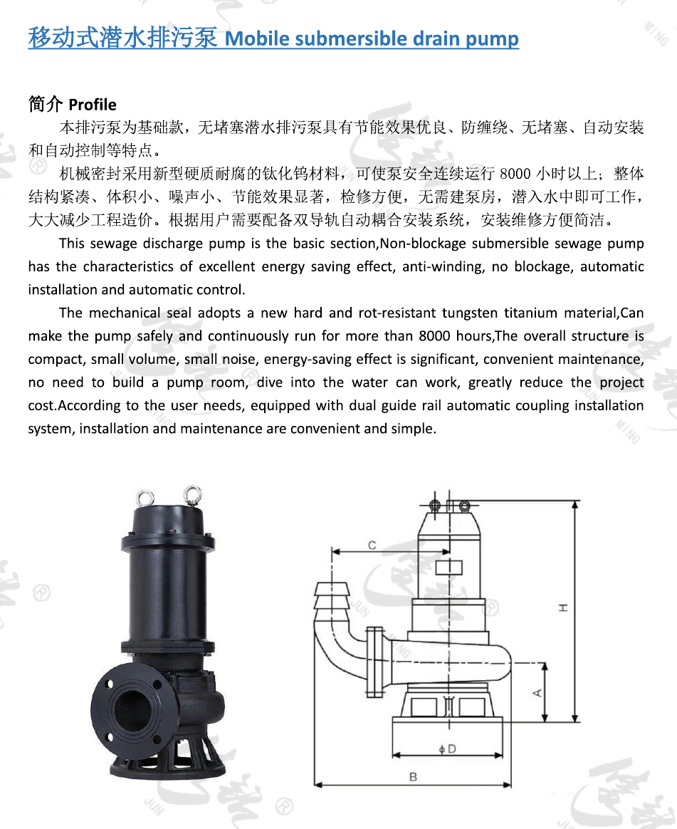 本排污泵為基礎(chǔ)款,無堵塞潛水排污泵具有節(jié)能效果優(yōu)良、防纏繞、無堵塞、自動(dòng)安裝和自動(dòng)控制等特點(diǎn)。